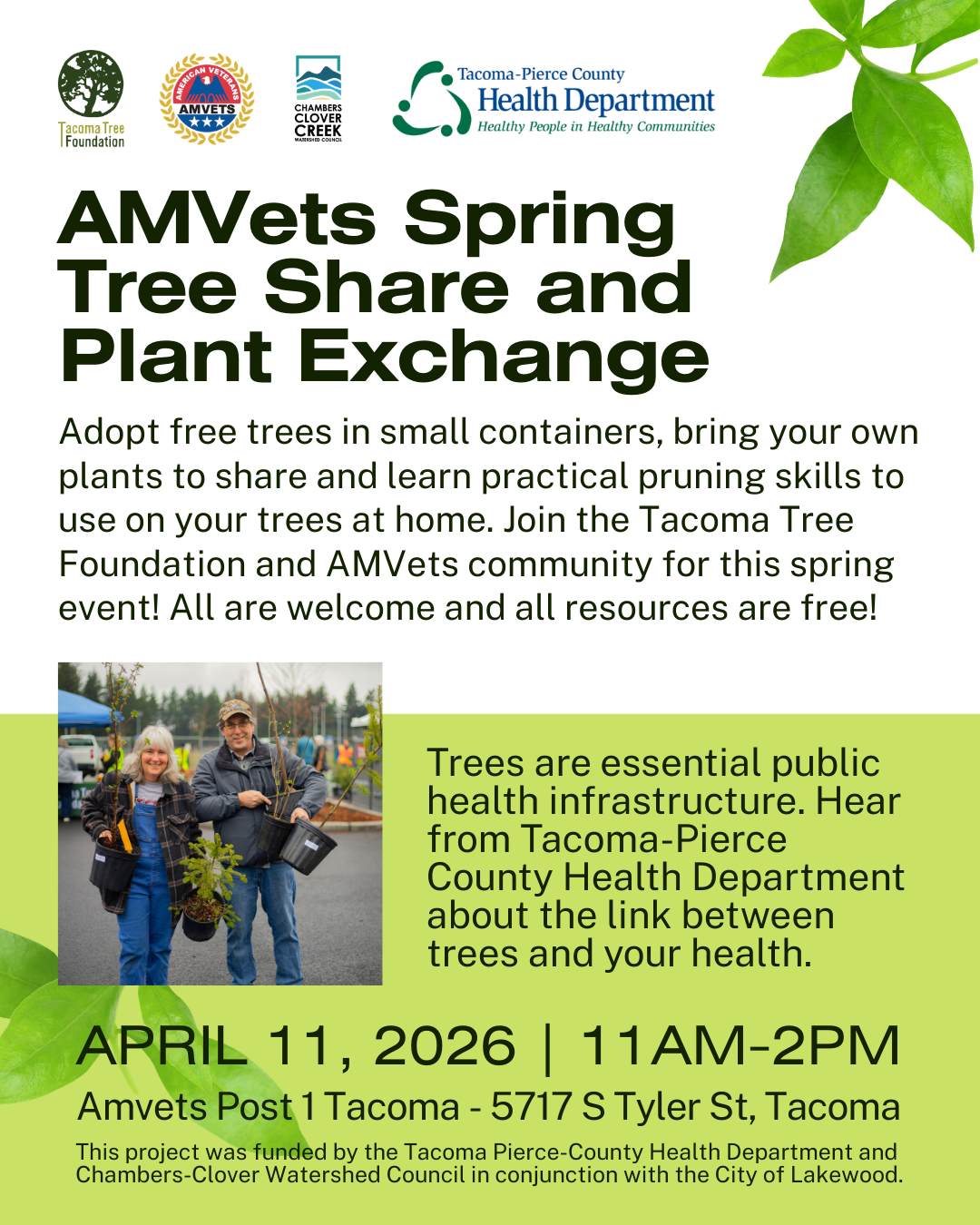 Adopt free trees in small containers, bring your own plants to share and learn practical pruning skills to use on your trees at home. Join the Tacoma Tree Foundation and AMVets community for this spring event! All are welcome and all resources are free!